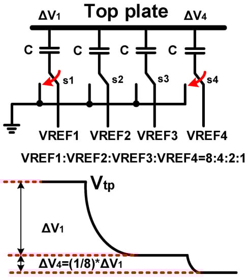 The ADC’s linearity is constrained by several factors. The first issue faced is the CDAC mismatch. According to capacitor mismatch theory, due to capacitor mismatch deterioration caused by size reduction, larger unit capacitors are needed to meet the linearity requirement [9,10]. However, the use of a large CDAC not only wastes power in the input and reference buffers but also imposes more stringent timing constraints. To reduce the total capacitance, the current mainstream solution is to reduce the size of the unit capacitor and then combine it with a digital calibration scheme [11]. However, whether based on self-calibration [12], LMS-based digital calibration [13,14,15], or capacitor mismatch shaping technology [16], these calibration schemes demand a significant amount of digital resources and lead to an increase in gain error. Therefore, these calibration solutions are more cost-effective for designs with 12 bits or more, but less so for the 10-bit design in this paper. The introduction of the dual-reference voltage technique [17] provides a new solution to reduce the total capacitance of the CDAC. Unlike the previous approach of reducing the size of the unit capacitor, the dual-reference voltage technique can directly reduce the total number of required capacitors in CDAC. The core theory of the multi-reference voltage scheme is charge conservation. In this paper, a 4-reference voltage technique is proposed based on this theory. Figure 4 shows the voltage jumping in the top plate of the CDAC during the switching process of the proposed 4-reference voltage technique. According to the law of charge conservation, it can be seen that the voltage change ratio ΔV1: ΔV4 satisfies 1:8 during the switching process of S1 and S4. However, to achieve a voltage jump ratio of 1:8 in a standard binary CDAC, the capacitance value of the corresponding bit position must satisfy an 8-fold relationship.