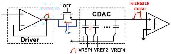 The second issue encountered by high-linearity ADCs is kickback noise. At sampling rates of hundreds of MHz [18,19], the comparator’s speed is usually as high as several GHz. During the entire SA phase, comparator kickback noise will be injected into the CDAC through the Cgs and Cgd of the input differential pair. Due to the samping transistor being in the OFF state, the kickback noise on the top plate of the CDAC will affect the front-end driving structure through the Cds of the switch transistor and will also be coupled to the output end of the RVB through the CDAC, as shown in Figure 5. Both situations will present a limiting factor for ADC resolution. This paper proposes a dynamic comparator kickback noise cancellation technique that can effectively solve the degradation caused by the kickback noise on the CDAC top plate.
