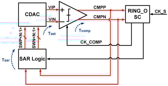In this design, the sampling time can be optimized at various sampling rates by adjusting the duty cycle through the clock generation circuit. This provides more time for the SA phase. During the SA phase, the speed limit of each bit conversion cycle is usually determined by the delay in the data path. The data paths in each bit conversion cycle, as shown in the red part of Figure 6, mainly include Tcomp, Tsar, and Tset.