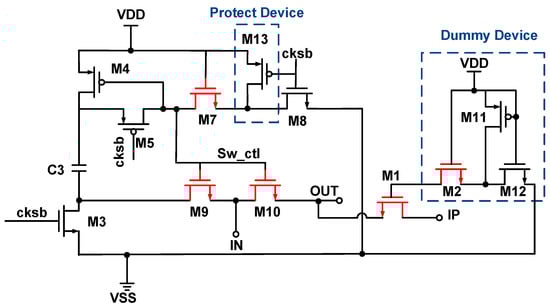 During the SA phase, the M10 switch is closed, and the input signal (IN/IP) is coupled to the top plate of the CDAC through the Cds of M10. This will directly lead to a degradation of the ADC’s performance, which can be cancelled by cross-coupling [21]. A dummy capacitor scheme similar to that of ref [1] is also used to cancel the coupling effect. Nevertheless, in ref [1], the gate voltage of M1 is directly grounded, but in this design, the gate position of M1 is increased to include M2, M11, and M12, which are the same size as M7, M8, and M13. Their main function is to make the environment around M1 and M10 consistent in the layout to achieve better matching and, thus, better cancellation of the coupling effect. In the layout of this circuit, all the transistors in the red part of Figure 8 are placed in the deep n-well (DNW), which can better reduce the Vbs of M10 and make the on resistance (Ron) more stable. In fact, the adoption of DWN and dummy transistors not only improves linearity but also leads to an increase in layout area.