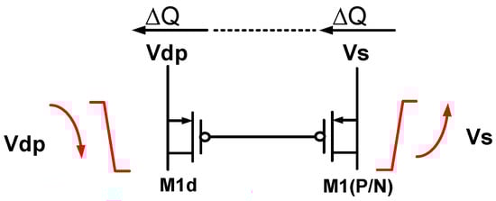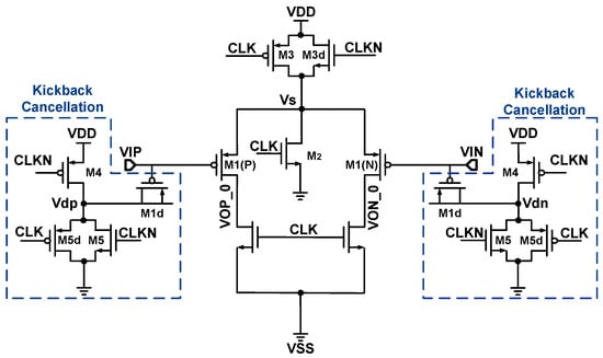 As described earlier, kickback noise is a common issue faced by all dynamic comparators, and its impact on the comparator is mainly manifested in the comparison phase. The kickback noise cancellation circuit proposed in this design is shown in Figure 9, where device M1d is a dummy transistor of M1, with its source/drain node discharged to ground during the reset phase of the preamplifier. When the comparator starts working, the comparator clock generates a falling edge, which causes the source terminal Vs of the input pair to start charging, producing an upward pulse that injects a charge amount ∆Q into the CDAC top plate, as shown in Figure 11. At the same time, the source-drain end of M1d produces a corresponding downward discharge pulse, which extracts a charge amount of ∆Q at the top plate of CDAC. In other words, all the charge injected by the input pair is taken away by the dummy transistor, effectively avoiding the impact of kickback noise. In addition, the purpose of the M4 and M2 transistor is to discharge Vs to ground and charge Vdp/Vdn to Vdd during the reset phase, so as to better ensure the consistency of charge and discharge at the CDAC top plate during the comparison phase.