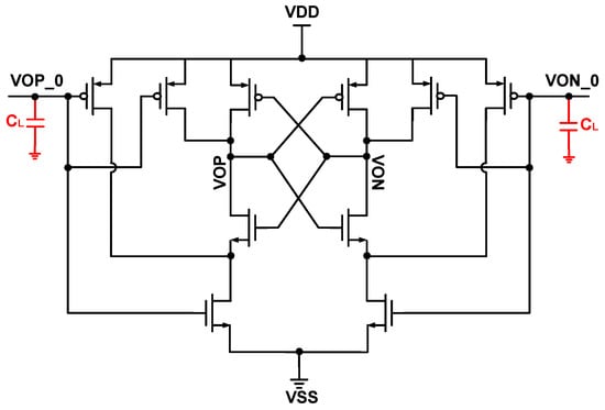 The dynamic comparator with kickback noise cancellation mechanism proposed in this paper uses a conventional two-stage structure consisting of a preamplifier and a latch stage, as shown in Figure 9 and Figure 10.