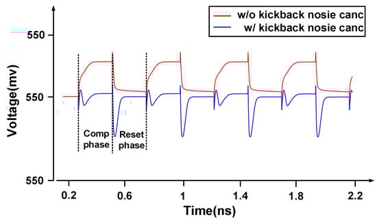 The transient simulation of the comparator is conducted to demonstrate the effectiveness of the kickback cancellation circuit. Assume that the capacitor from the comparator input to ground is 410 fF and that the operating frequency of the comparator is 2 GHz. The transient simulation result of the comparator input voltage with and without the kickback cancellation circuit is shown in Figure 12, and it can be seen that the kickback cancellation mechanism plays a good suppression role for kickback noise in the comparison phase. In fact, the source-drain end of M1d needs to undergo charging and discharging operations in each comparison cycle, which increases the power consumption of the comparator. When the comparator operates normally at a frequency of 3 GHz, the approximate increase in dynamic current can be calculated using the CVF formula as 300 µA. Therefore, this structure trades off power consumption for the low kickback input characteristics of the comparator.