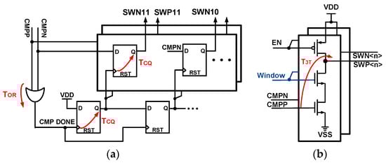 According to the previous introduction, the delay Tsar on the SAR logic is a part of the data path in the bit conversion cycle. The traditional SAR logic consists of two stages of DFF, and the delay of the Tsar is shown as the red line in Figure 13a, which can be represented as: Tsar = 2 × Tcq + TOR, where TOR is the delay of the OR gate and TDFF is the delay of the shift register and the data register.