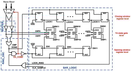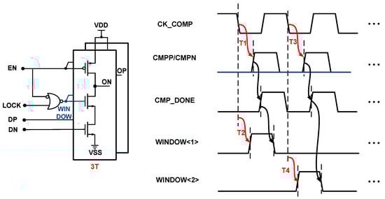 To reduce the delay of Tsar, the proposed SAR logic uses a window-opening strategy to open the “window” signal in advance before each bit of data arrives and complete the “window” signal closing operation after data transmission. Figure 14 illustrates the scheme of the proposed SAR logic based on the window-opening strategy. The circuit of the tri-state gate is shown in Figure 15 (left), and the timing block of the window-opening is shown in Figure 15 (right). The bit cycling begins immediately after CLK_SAMPLE pulls down. The first DFF output EN1 of the opening window register level is high, opening the “Window” signal of the first tri-state gate. After the comparison process, the resultant signal is directly passed through the 3T structure. At this time, due to the high pulse generated by the CMP_DOWN signal, it will trigger the first DFF of the closing window register level to output a high level of LOCK1, thus locking the “window” signal. After the first reset phase of the comparator is completed, the second DFF output EN2 of the opening window register level is high, and the “window” signal of the second tri-state gate is opened to wait for the second comparator result. The remaining bit-cycling process is sequentially executed in this way until the last bit triggers the LOCK_RING signal to end the SA phase.