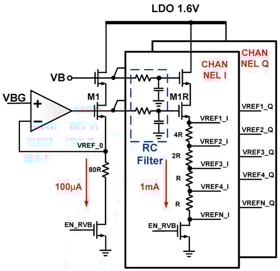 The open-loop output stage structure provides a small output impedance, a wide bandwidth, low noise, and a small area. The following Figure 16 shows the proposed RVB. The output stage of the IQ channels replicates the second stage of the closed-loop operational amplifier, and the size of the output transistor M1R in both IQ channels is ten times that of M1. Moreover, in order to address the impact of power supply noise on the reference voltage, the output stage is implemented as a cascode structure, with VB providing the bias voltage for the stacked transistors, resulting in an improved power supply rejection ratio (PSRR). Additionally, RC filters have been incorporated into the design to minimize the effects of operational amplifier output noise.