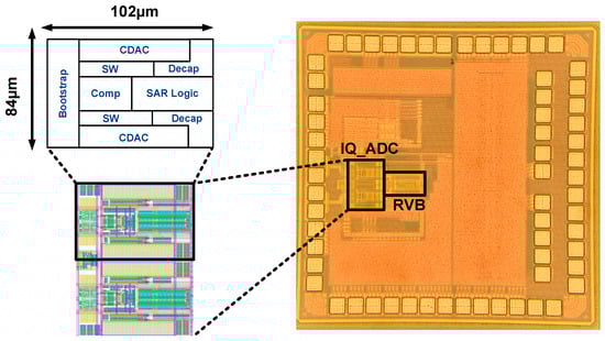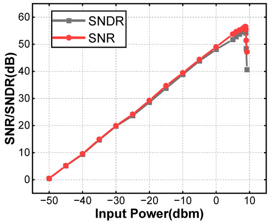 For SAR ADCs, the CDAC occupies the most significant area. The incorporation of the 4-reference voltage method provides a significant advantage in terms of area efficiency, surpassing other designs with similar FOM values that utilize more advanced processes. Remarkably, the proposed ADC occupies only 0.008 mm2 of core area. The design of a high-linearity bootstrap, low-noise comparator, and low-mismatch CDAC enables the proposed ADC to achieve impressive SNDR and SFDR of 55.3 dB and 66.6 dB, respectively, at a sampling rate of 200 MHz and Nyquist input frequency. These results meet the system’s requirements for ADC sampling rate and effective resolution. The measured SNR results also closely align with the SNR values calculated based on the noise budget in Table 2, reflecting excellent design matching. In addition, in the subsequent large-scale testing (results not shown), the deviation of the SNDR was concentrated within 0.5 dB, further demonstrating that the proposed ADC can meet the requirements of large-scale production effectively.