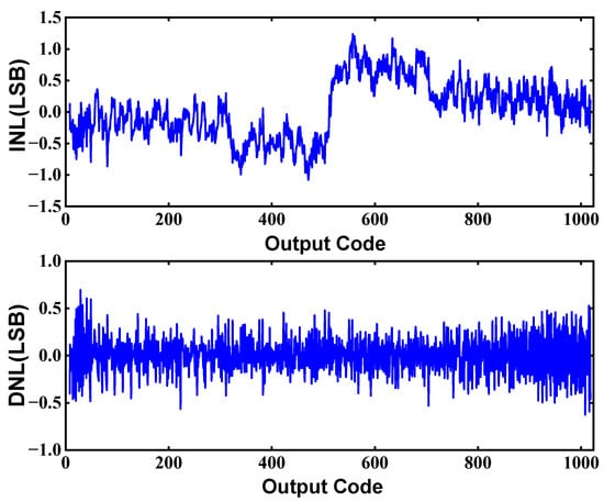 During the testing, the ADC operated with a reference voltage of 1.2 V. To achieve a full-swing output, the input VPP was increased to nearly 1.1 V. This indicates a gain error of approximately 9%. At a sampling rate of 200 MHz, the SA phase and sampling phase timings are adjusted using the clock duty cycle adjustment circuit inside the test chip to meet the requirements of sampling and conversion. All subsequent tests were conducted based on a sampling rate of 200 MHz.