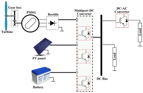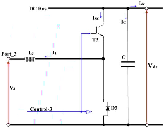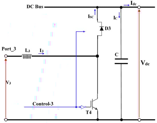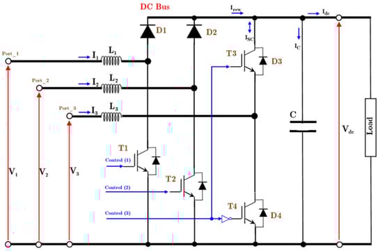 In fact, these converters’ benefits include their centralized control, low cost, high conversion ratio, continuous input current and compact architectures [22]. In the literature, systematic approaches to the synthesis of MCs’ diverse topologies based on various input sources have been also developed [23,24]. In order to allow power to flow between each port, the multiport converter’s main objective is to connect several power sources with inputs and outputs through a single power converter. The redundant and unnecessary power conversion stages and excessive solid-state switching components that are frequently seen in conventional topologies are eliminated by these multiport converters [25].