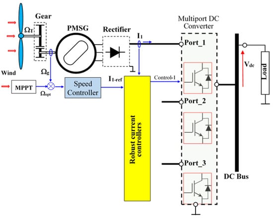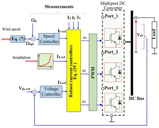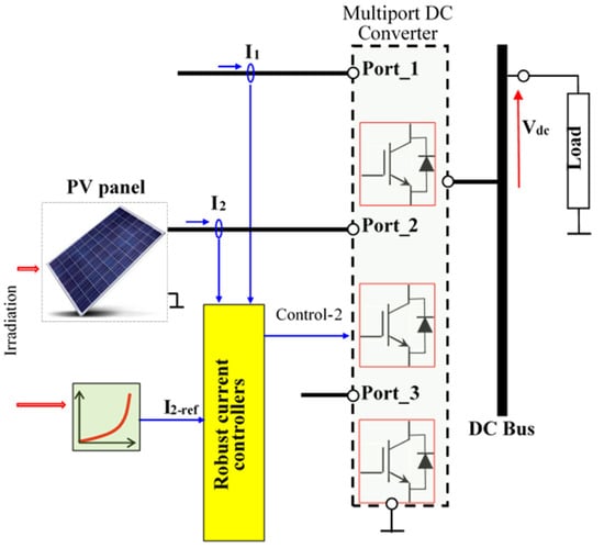 Due to fluctuations in the generated voltages, a control scheme is necessary to stabilize the output voltage level. In this context, the proposed multiport converter supports a battery port, with a bidirectional power flow [32]. The control scheme ensures the stability of the DC-Bus voltage and the extraction of the maximum power from the renewable sources [31,33,34,35].