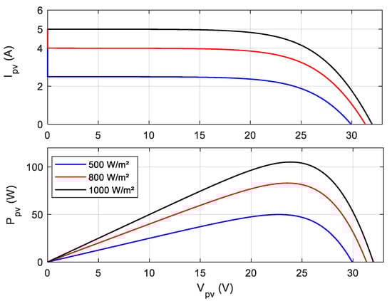 The voltage–current (V-I) and voltage–power (V-P) characteristics according Equation (8) are given in Figure 7.