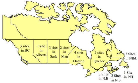 The C-LTPP database covers 24 highway test sites in Canada’s major provincial highway systems [29]. The geographic distribution of the sites is presented in Figure 2. The test sites include from two to four different test sections that use different repair schemes. They constitute a total of 65 test sections with different pavement structures and service environments after repair. The effective length of each test section is 150 m. Meanwhile, this dataset provides many variables, including material, structure, traffic, climate, and rehabilitation, which can support various studies on the service performances of pavements repaired with flexible overlays. The data can be downloaded free from the online website (https://infopave.fhwa.dot.gov, accessed on 2003).