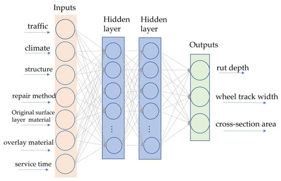 Neural networks have been widely used in the service performance prediction of asphalt pavement [20,21,22,23], but there is little research on applying ANNs to pavement overlay rutting prediction. Abo-Hashema [24] applied an ANN to predict the appropriate pavement overlay thickness. Abiola [25] and Wang [1] proposed an ANN model to predict the rutting depth of asphalt pavement. However, these input variables do not include the thickness of the overlay layer, the overlay material, or repave measures. Hall [26] analyzed the impact of different maintenance measures on the smoothness index, rutting, and cracks of flexible pavement. It is believed that the overlay thickness is the most important influencing factor besides climate and the axial load.