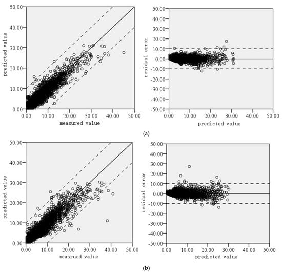 By comparing the deviation between the measured value and predicted value and the error distribution, the prediction model’s performance for the rutting development trend of the repaired pavement can be investigated. Figure 5 shows the comparison results.