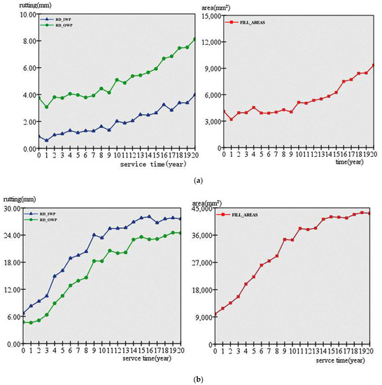 The rut depth on the left and right sides and the characteristics of the total filling area of the rut cross-section were plotted as curves over time, as shown in Figure 6. It can be seen that the rut depth generally increases with the cumulative service time, which is consistent with the actual development law.
