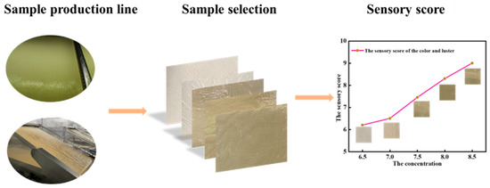 Five concentrations of bean slurry (6.5%, 7%, 7.5%, 8%, and 8.5%) were used to carry out the Yuba skin production test. Each concentration of Yuba skin was collected at the end of the production line, and a total of 5 groups of test samples were collected. The collected Yuba skin was stored in a drying oven and labeled. In this evaluation experiment, six evaluation experts were selected, aged 20–30, including three males and three females, all of whom were in good health and had normal vision. Relevant evaluation training was provided to the reviewers before the evaluation to ensure accurate evaluation results. The test site was a room with normal light, and the six judges scored the color of the five groups of test samples, and the subjective evaluation value of the color of the fermented soybean peel was obtained; the results are shown in Table 2. As can be seen from Table 2, the surface color scores of the five groups of Yuba skin samples at different concentrations ranged from 6.28 to 9.05, and the Yuba skin sample with the highest color score was group 5. When the original image of the sample was visually inspected, the color change of the Yuba skin sample corresponds to different slurry concentrations, which represents that an increase in the pre-pulp concentration which can moderately deepen the Yuba skin color.