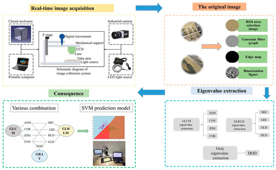 In recent years, researchers have analyzed the acoustic properties [6,7], optical properties [8,9], and acoustic vibration [10,11] for nondestructive testing. With the development of machine vision technology [12,13,14,15], extensive research has been con-ducted on sorting operations for numerous agricultural products. Su et al. analyzed the appearance and size characteristics of potatoes using a convolutional neural network. Non-destructive grading of potatoes was achieved [16]. Tian et al. analyzed the image features of apples using the YOLOv3 model. Non-destructive grading of apples was achieved [17]. Liu et al. analyzed the color characteristics of tomatoes with different ripeness using a color HSV model. Nondestructive grading of tomatoes was achieved [18]. Kumar et al. analyzed the color, shape, and texture features of tomatoes using an SVM model. Non-destructive grading of tomatoes was achieved [19]. Olaniyi et al. analyzed the GLCM texture features of bananas using a neural network model. Non-destructive grading of bananas was achieved [20]. Huang et al. analyzed the image features of spinach samples using a BPNN model with multisensory data fusion. Non-destructive grading of spinach was achieved [21]. At present, the quality inspection of Yuba skin relies on human experience to determine the color and texture characteristics of the Yuba skin surface through human eyes, and then grade the Yuba skin, which is not accurate and cannot achieve intelligent grading of the Yuba skin quality. Thus, machine vision holds promise as an objective and nondestructive means for improving Yuba skin testing and accuracy, thereby adding value.