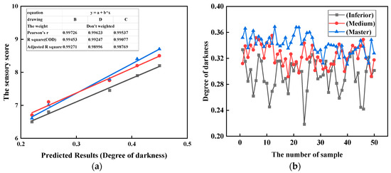 The factors affecting the quality score of Yuba skin mainly include the processing equipment and technological process. In the technological process, if the concentration of slurry increases, the protein content becomes higher, and the color of Yuba skin deepens which the main reasons for the quality change. Therefore, we need to further explore the average gray level to determine whether there is a certain correlation between the value and the quality of Yuba skin. The quality scores of Yuba skin samples produced at different concentrations were determined by the sensory method, and the average gray value of the surface of Yuba skin samples at different concentrations was determined by the image processing method. When the image is an 8-bit pixel image, the brightest pixel has a value of 255 (white), the darkest pixel has a value of 0 (black), and the other pixels have different grayscale intensity values between 0 and 255. According to this, the average gray intensity value was normalized using Equation (1), and the obtained normalized value was defined as the degree of darkness (DOD) of the Yuba skin. The three groups of image processing results (prediction data) and sensory scoring results (experimental data) were linearly fitted, as shown in Figure 4a. The data fitting results show that there is a strong relationship between the average gray value and the quality of the Yuba skin. Correlation (R2 of the three groups are 0.99453, 0.99247, 0.99077, respectively), therefore, of the grayscale eigenvalues can be used as an alternative method for the quality score of the Yuba skin.