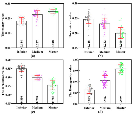 GLCM eigenvalue comparisons. (a) ASM numerical comparison; (b) CON numerical comparison; (c) COR numerical comparison; (d) IDM numerical comparison. In the figure, black represents inferior Yuba skin, red represents medium Yuba skin, green represents master Yuba skin.