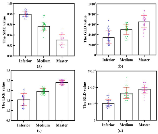 GLRLM eigenvalue comparisons. (a) SRE numerical comparison; (b) GLD numerical comparison; (c) LRE numerical comparison; (d) RLD numerical comparison. In the figure, blue represents inferior Yuba skin, green represents medium Yuba skin, red represents master Yuba skin.