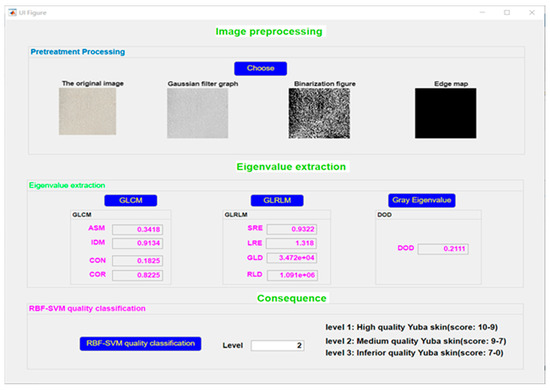 SVM-based software for grading the quality of Yuba skin was developed using a graphical user interface library in MATLAB. The grading software interface consisted of a preprocessing image module, feature value extraction module, and quality result module (which has a final kernel function). The software preprocesses and displays the image of the Yuba skin to be evaluated. The corresponding eigenvalue in the feature value extraction module is then calculated, and the user clicks the RBF-SVM grading button in the final quality result module to display the corresponding quality grading results. The software interface is presented in Figure 8.