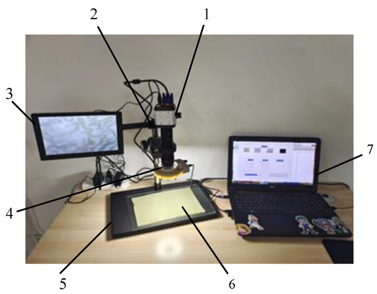 Quality grading system test platform. (1) CCD; (2) Z stage; (3) LCD; (4) LED light source; (5) plane light source; (6) Yuba skin; (7) portable computer.