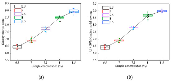 Comparison of sensory method and RBF-SVM grading system scores. (a) Sensory method scores; (b) RBF-SVM grading system scores.