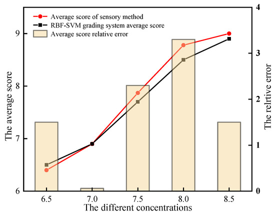 Two methods were used to score the Yuba skins with different concentrations, and 10 groups of Yuba skin samples were produced using the same concentration, and the scoring results were shown in Figure 10. Both methods showed that, in the concentration range of 6.5% to 8.5%, the score of the Yuba skin gradually increased with the increase in concentration. Moreover, the average score difference obtained by the two methods was small, which verifies that the results of the RBF-SVM grading system are in good agreement with the results of the actual sensory method. The average score data of each concentration using the two methods were calculated and analyzed, and the relative error results of the actual sensory method score value and the RBF-SVM grading system score value are shown in Figure 11. As shown in Figure 11, the relative error of the two methods reached a maximum of 3.31% when the concentration was 8.0%, and the minimum error of the two methods was 0.06% when the concentration was 7.0%. The relative error of the different concentration test groups was within 5%, and the test results were in line with expectations, which further proves the applicability of the RBF-SVM grading system in the quality detection of Yuba skin.