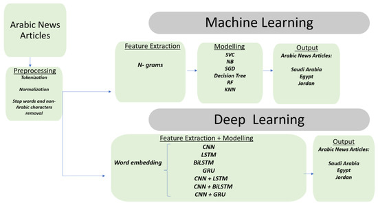 We trained and tested two datasets of Arabic news articles from two topics, the Hajj and Brexit, from three Arabic countries, Saudi Arabia, Jordan, and Egypt, along with heterogeneous feature spaces. Our work utilized the ML algorithms SVM, Multinomial NB, Bernoulli NB, SGD classifier, decision tree, random forest, and KNN, and demonstrated that classifying articles based on their country of origin was an amenable problem. For the traditional machine learning algorithms, a combination of n-grams with linear SVC was superior to the other ML algorithms for the Hajj dataset, with n-gram = 3 with linear SVC best for the Brexit dataset, achieving accuracies of 93.1% and 83.0%, respectively. On the other hand, for the deep learning and hybrid deep learning models with the Hajj dataset, random embedding with CNN+LSTM reached an accuracy of 94.4%, while FastText embedding with CNN reached the highest accuracy of 76.87% for the Brexit dataset.
