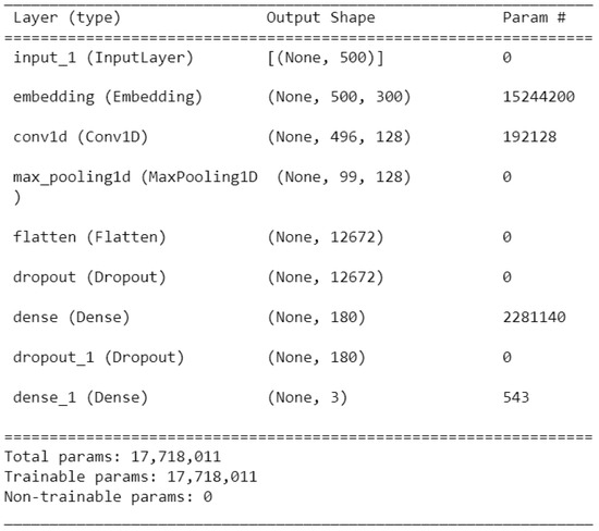 Figure 9. The first layer was the word encoding layer, then a conventional layer was added, followed by a max-pooling layer and a drop-out layer to help prevent the network from overfitting. An LSTM layer with a hidden size of 128 was added and the softmax activation function was used to generate the final classification, as shown in