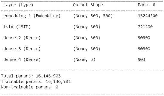 Figure 6; the first layer was the word encoding layer. The next layer was the LSTM layer, with 128 memory units. The activation function was softmax, and categorical cross-entropy was used as the loss function.