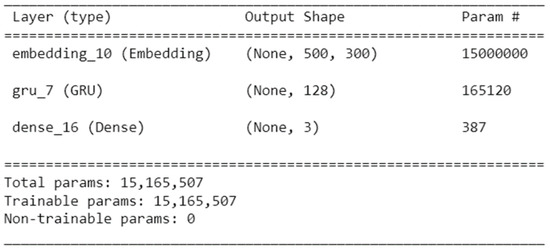 In GRU, the embedding layer was the first layer in the network fed into a GRU layer with 128 units, which had a dropout rate of 0.2 to prevent overfitting. A dense layer with a softmax activation function was added to output the classification probabilities for the three classes. The model was compiled with a categorical cross-entropy loss function Adam optimizer, as shown in