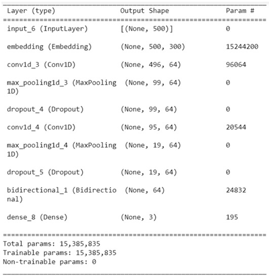 In this architecture, the word encoding layer was the first layer. Conventional layers were added followed by a max-pooling and a dropout of 0.2 to help prevent overfitting. Afterward, a bidirectional LSTM layer was added. Finally, a dense layer with a softmax activation function was used to generate the final classification, as shown in