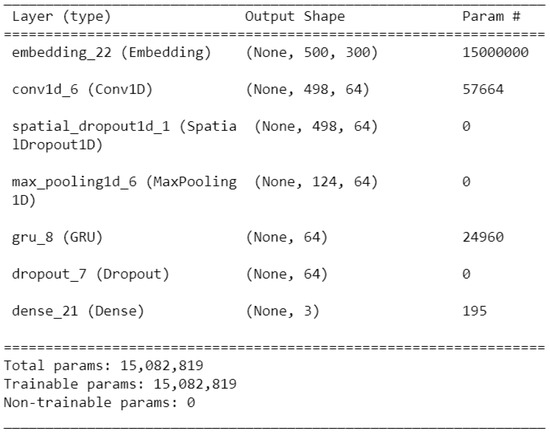 In this architecture, a fully connected conventional layer was added after the word encoding layer followed by a max-pooling and a dropout of 0.2 to help prevent overfitting. The output of the conventional layer was then fed to the GRU layer with 128 units, which had a dropout rate of 0.2 to prevent overfitting. A dense layer with a softmax activation function was used to generate the final classification, as shown in