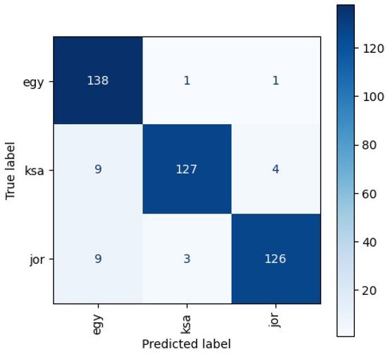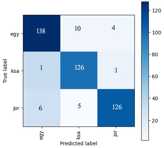 Similarly, random embedding with the hybrid model of CNN+LSTM classified 138 Egyptian articles correctly and misclassified two articles. There was a noticeable difference between the results for misclassified Saudi and Jordanian articles, with 13 and 12 incorrect articles for both KSA and Jordan, respectively, as seen in