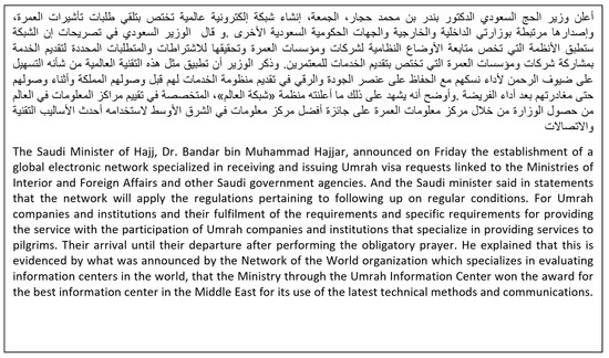 A possible explanation is that most of the articles on the topic of Hajj were distinctive between all three Arabic countries, Saudi Arabia, Egypt, and Jordan because the topic had a direct impact on them. This impact created a link between unique words that formulated the news articles for each country. For example, most Saudi articles presented senior political figures with their full titles, such as “His Royal Highness Prince Khaled AlFaisal”; however, some Jordanian articles would indicate him as “Prince Khaled AlFaisal”. So, words such as “highness” would be linked mostly to articles originating from Saudi Arabia. However, since the topic of Brexit did not have the same impact on Arabic articles as the topic of Hajj did, and most of the articles described issues concerning foreign events related to the topic, unique words linking them to the three originating countries were not used. This would explain why the model needed to be trained on higher n-grams than 1—in this case, n-gram = 3.