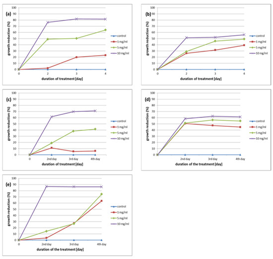 Similar to the root extract of P. media, there is a clear tendency for the activity of the leaf extract of P. lanceolata to be dependent on the time of exposure. The highest Acanthamoeba trophozoites growth inhibition was noticed after incubation with the extract at 10 mg/mL (on the second day 86.85%, on the third day 86.35%, and on the fourth day 86.27%) (Table 3).