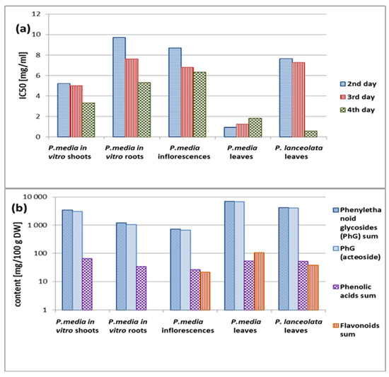 Comparison of IC50 values of anti-acanthamoebic activity (a) with the content of phenolic secondary metabolites in the investigated organs of Plantago (b).