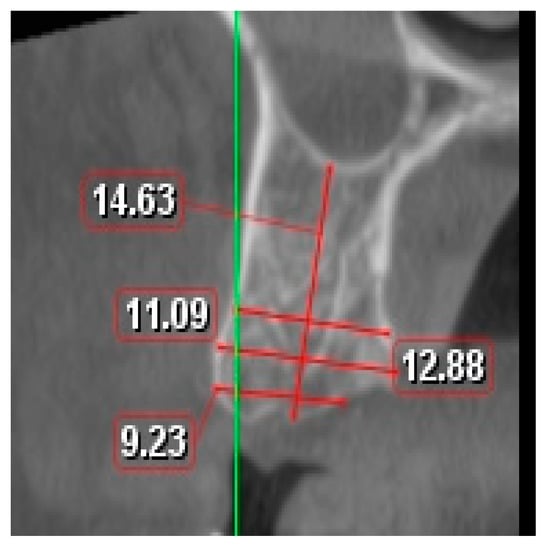 The two images were superimposed manually using specialized software (OnDemand3D, Cybermed Inc., Daejeon, Republic of Korea) [35] while using two adjacent anatomical structures as fixed landmarks. Using linear measurement tools, the width of the socket was measured at three different distances of 1, 3, and 5 mm from the most coronal point of the bone crest, and the length of the socket was measured from the bone crest to the sinus floor (Figure 1). The analysis was conducted in central and proximal sites following a 45°-degree orientation at the axis of the tooth as a reference.