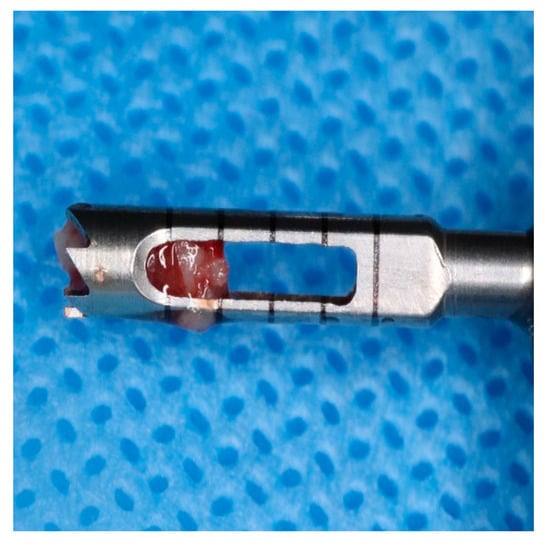 Six months after the ARP procedure and at the time of implant placement, three different bone samples were harvested from each group. The samples were collected as follows: The area indicated for implant placement was anesthetized locally using Lidocaine HCI and a 1:100,000 epinephrine injection (2%Xylocaine, DENTSPLY Pharmaceutical, York, PA, USA), administered buccally and palatally. The surgical stent was used to locate the initially grafted area; then, a full-thickness flap was elevated to expose the underlying bone, and before initiating the implant drilling protocol, a 3 mm in diameter trephine bur (Knochenfrasen-Trephine Bur, Bremen, Germany) was used to harvest a 6 mm long bone sample (Figure 2). Extreme care was taken during harvesting to avoid compromising the implant bed preparation and to avoid jeopardizing implant placement. Afterward, the bone samples were preserved in 10% neutral formalin (Sigma-Aldrich, St. Louis, MO, USA).