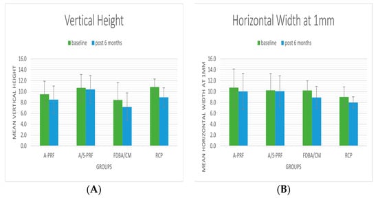 The comparison of the mean ranks between baseline and post-6 months for the outcome variables in each of the four study groups showed statistically significant differences for all four outcome variables for two groups (FDBA/CM and RCP). That is, the mean positive and negative ranks for the differences in all these four outcome variables in these two groups were statistically significantly different. These data indicate that the vertical height, horizontal 1 mm, horizontal 3 mm, and horizontal 5 mm values had significantly decreased at 6 months when compared with the values at baseline in these two groups. The corresponding p-values were <0.05. For the PRF group, statistically significant differences were observed for two outcome variables (vertical height and horizontal 5 mm); the values of these two outcome variables in these two groups had decreased at six months when compared with the values at baseline (p = 0.041 and p = 0.007). For the other two outcome variables (horizontal 1 mm and horizontal 3 mm), there were no statistically significant differences between baseline and post-6 months. For another study group (A/S-PRF), the values of all four outcome variables (vertical height, horizontal 1 mm, horizontal 3 mm, and horizontal 5 mm) were not statistically significantly different between baseline and post-6 months (Table 3).