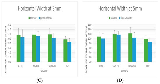 The comparison of the mean ranks of the differences between baseline and post-6 months for each of the four outcome variables (vertical height, horizontal 1 mm, horizontal 3 mm, and horizontal 5 mm) among the four study groups showed no statistically significant differences for any of the four outcome variables. That is, the differences between baseline and post-6 months for vertical height, horizontal 1 mm, horizontal 3 mm, and horizontal 5 mm across the four study groups were not statistically significant. A post hoc test showed that, for the outcome variable (horizontal 5 mm), the differences between baseline and post-6 months for A/S-PRF bone were significantly lower than the differences for the FDBA/CM and RCP groups (p < 0.05) (Table 2) (Figure 3).