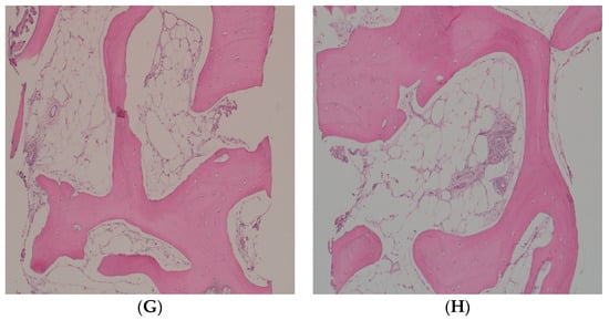 A-PRF group (A,B): Mature lamellar bone can be observed, with many osteocytes residing in the lacunae, while fibrovascular bone marrow is observed at the periphery (hematoxylin–eosin; original magnification; (A) ×10; (B) ×20). A/S PRF group (C,D): Mature lamellar bone can be observed, with many osteocytes residing in the lacunae. The fibrofatty marrow contains scattered inflammatory cells (C). Osteoblastic rimming (arrow) (D) (hematoxylin–eosin; original magnification; (C) ×10; (D) ×20). FDBA/CM group (E,F): A mixture of mature vital and non-vital bone tissue. The non-vital bone grafted bone is present in the center and surrounded by vital bone (arrow) (F) (hematoxylin–eosin; original magnification; (E) ×10; (F) ×20). RCP group (G,H). Mature/vital bone embedded in a fibrofatty marrow (G). Higher magnification to show the fatty bone marrow (H) (hematoxylin–eosin; original magnification; (G) ×10; (H) ×20).