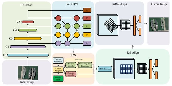 This section presents the architecture of ReBiDet. Figure 1 illustrates the five modules of ReBiDet: the feature extraction module ReResNet [21], the feature pyramid construction module ReBiFPN, the bounding box generation module RPN, the RoIAlign module for extracting feature maps of horizontal bounding boxes and performing preliminary classification and rotation bounding box generation, and the RiRoIAlign [21] module for extracting feature maps of rotation bounding boxes and performing classification refinement and rotation bounding box parameter refinement.