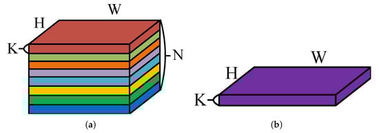 Difference between the feature maps extracted by ReResNet and ResNet networks. (a) Feature maps extracted by the ReResNet network, denoted as (K, N, H, W), where N is an additional dimension compared to traditional ResNet feature maps shown in (b). Here, N = 8 indicates that discrete rotation group convolution can extract feature maps at 8 different rotation angles.
