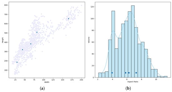 Aspect ratio distribution and K-means clustering results of labeled boxes in the HRSC2016 dataset. (a) Scatter plot of the distribution of the length and width values of all labeled boxes. (b) Histogram of the aspect ratio distribution of all labeled boxes.
