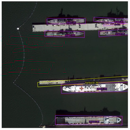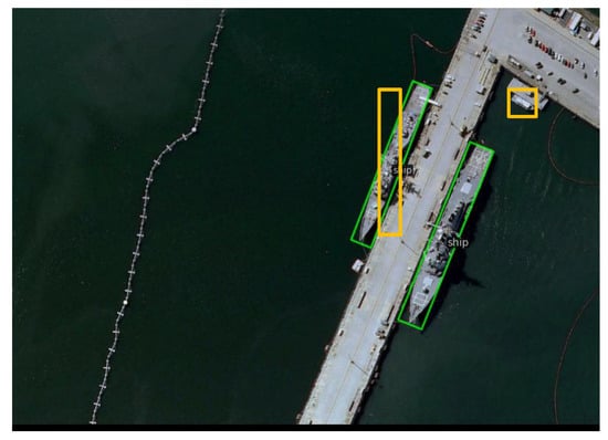 For ship detection in optical remote sensing images, our research is still in its early stages, with quantitative research serving as the focal point of our future work. Concerning the issue of inaccurate detection accuracy evaluation due to incomplete object annotations in HRSC2016, we intend to manually re-annotate all ship targets in the HRSC2016 dataset in our next study. This will enable us to conduct a comprehensive comparison of various evaluation indicators based on the model’s performance in existing detection models, ultimately leading to breakthroughs in improving detection performance. Furthermore, as illustrated in Figure 15, ReBiDet encounters an issue of inaccurate detection box positioning when detecting elongated objects such as ships. This issue primarily stems from inadequate training of the detection box during the alignment regression stage. We plan to explore potential solutions to this problem, including, but not limited to, modifying the loss function and the bounding box alignment regression module.