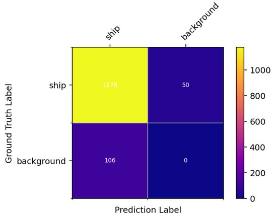 We further analyzed the detection results of the ReBiDet model on the HRSC2016 dataset and generated a confusion matrix as shown in Figure 8. The test set contained 1228 annotated ground truth boxes. Our model correctly detected 1178 ships, missed 50 ships, and misclassified 106 background images as ships. We were surprised by the misclassification of the background images, but upon visualizing the results, we discovered that incomplete annotations in the HRSC2016 dataset might be the main reason for this. The original author did not fully annotate all objects that should have been labeled as ships in this dataset. Incomplete annotations in the test set can negatively impact model performance during testing. Figure 9 illustrates that the model detected some ships that were not fully labeled during testing. However, due to the incomplete annotation information, the validation program could not accurately determine if these ships were correctly detected, leading to their misclassification as false positives and a decrease in the model’s mAP.