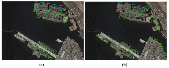 Comparison between the ground truth label and detection result of an image in the test set of HRSC2016. (a) Image annotated with the ground truth label. (b) Our detection result on the same image.
