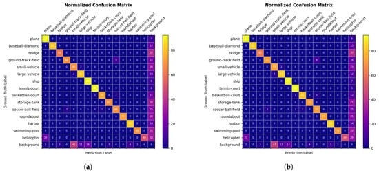 Normalized confusion matrix on the DOTA dataset. (a) The detection results of ReDet reproduced by us. (b) The detection results of ReBiDet. The unit of the numbers in the figure is percentage (%), representing the percentage of ground truth label targets.